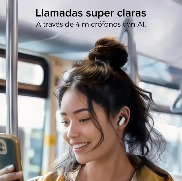 Llamadas nítidas mejoradas con 4 micrófonos Al: Experimente llamadas claras donde quiera que vaya con 4 micrófonos integrados en los auriculares inalámbricos, junto con un algoritmo Al que capta su voz con precisión.
