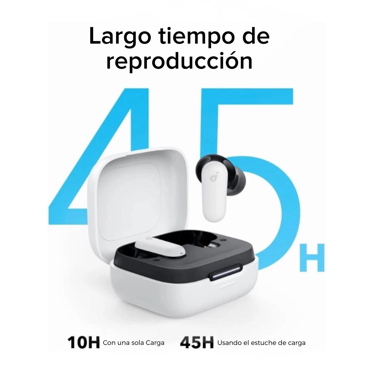 Cancelación de ruido fuerte e inteligente: reduce el ruido hasta 42dB con un avanzado sistema de cancelación activa de ruido. Con tecnología adaptativa, el soundocre P30i detecta sonidos externos y selecciona automáticamente un nivel de cancelación de ruido optimizado para sus oídos.