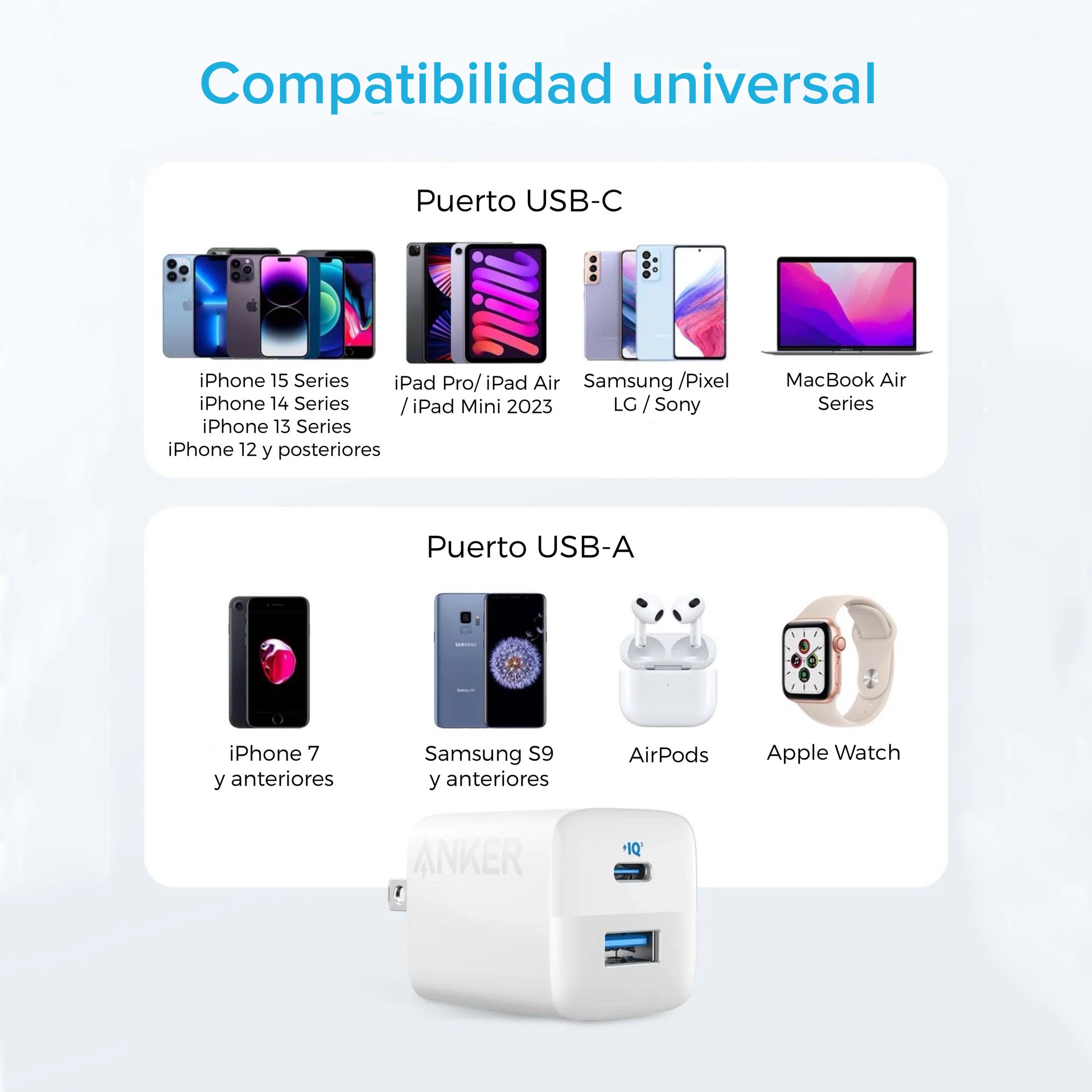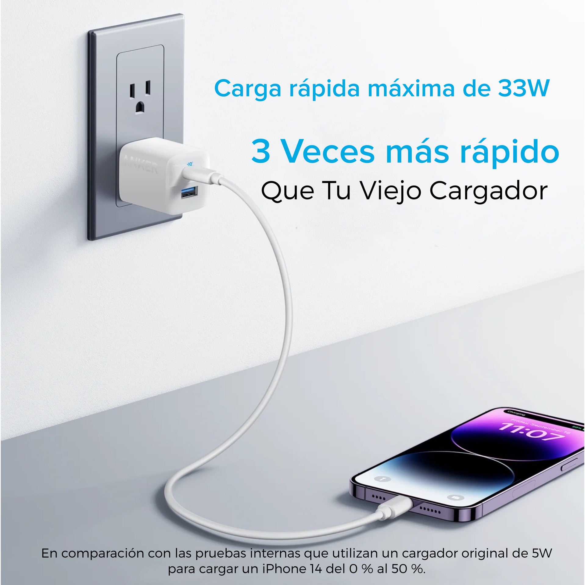 El cargador ultracompacto de 2 puertosPotente carga USB-CEl puerto USB-C tiene una salida máxima de 33 W, suficiente para cargar un iPhone 14 del 0 % al 50 % en solo 25 minutos.Carga 2 dispositivos a la vezConecte un dispositivo al puerto USB-C para obtener una carga de 20 W, y conecte otro dispositivo al puerto USB-A para cargar hasta 12 W.Amplia compatibilidadFunciona con prácticamente cualquier dispositivo de mano, incluidos teléfonos, tabletas y más.Carga con tranquilidadEquipado con nuestro sistema de seguridad ActiveShield para ofrecer una protección mejorada. Cuenta con un sensor de temperatura dinámico que monitorea activamente la temperatura y un chip de sintonizador de potencia que ajusta la potencia de salida para proteger su dispositivo conectado.Listo para llevar a cualquier parteLleve este cargador de doble puerto con usted a donde quiera que vaya gracias al diseño ligero y compacto y a las puntas plegables.Contenido de la caja:Cargador Anker 323 (33 W), guía de bienvenida.Garantía: