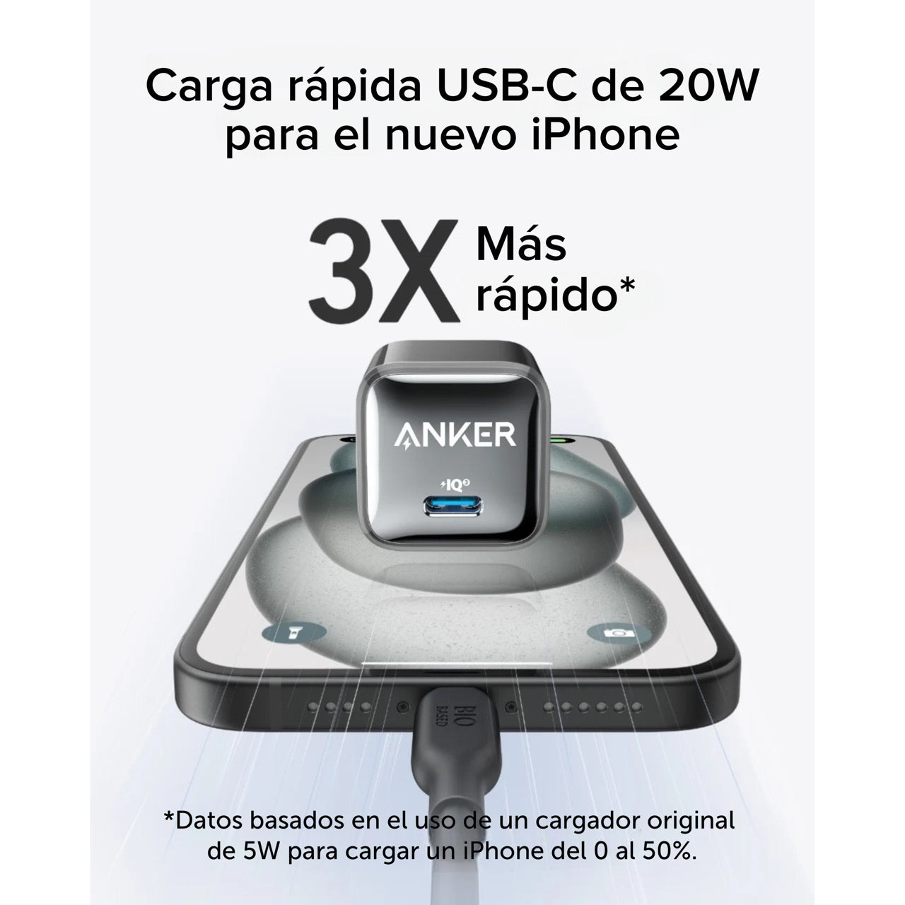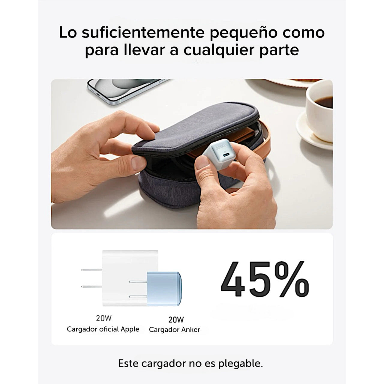 Un 45% más pequeño que un cargador original de 20W, pero igual de potente.