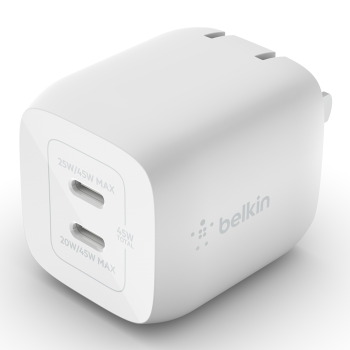 Cargue su MacBook o cargue rápidamente un iPhone 14 o Samsung Galaxy al mismo tiempo con nuestro potente cargador de pared USB-C dual ultracompacto de 45 W. Incluye las tecnologías de carga GaN, USB-C PD 3.0 y PPS, que ofrecen una carga rápida y segura.