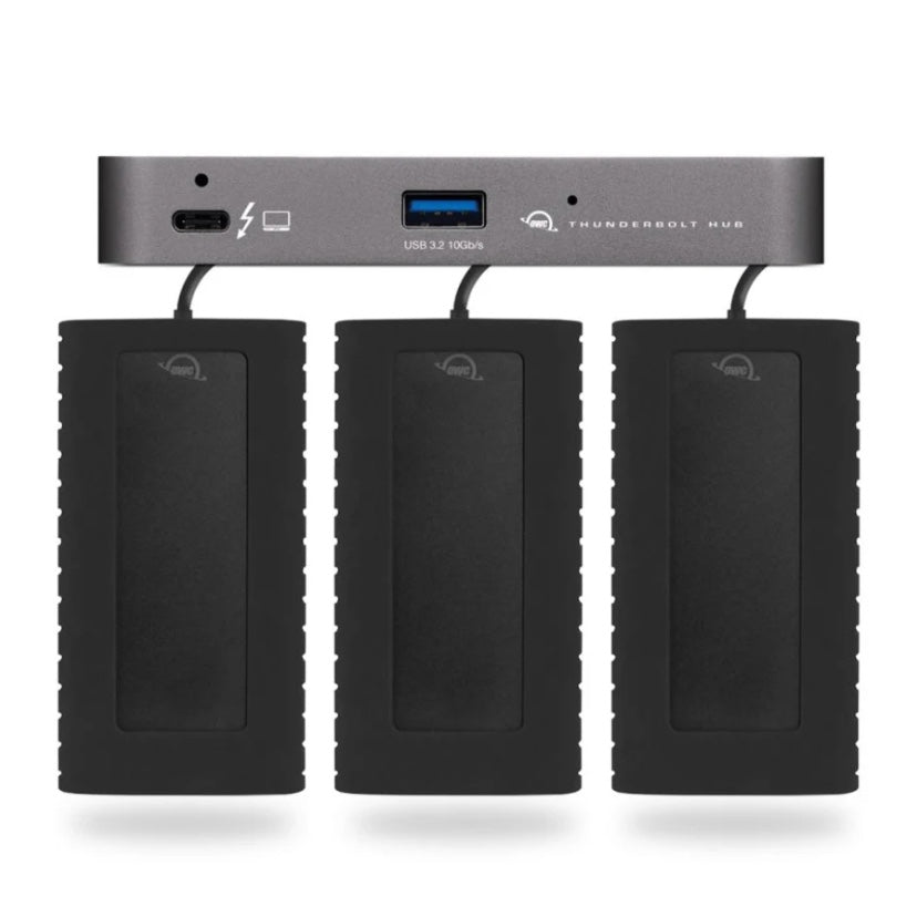 En el pasado, el almacenamiento externo de encadenamiento de margaritas requería que lo colocara lo más cerca posible de la parte delantera de la cadena para un rendimiento más rápido y confiable. Eso no era posible con las unidades de autobús. Tenían que ser colocados últimos en la cadena Thunderbolt... ¡y la cadena estaba limitada a un solo dispositivo alimentado por bus! Ahora puede conectar varios SSD portátiles directamente al OWC Thunderbolt Hub.