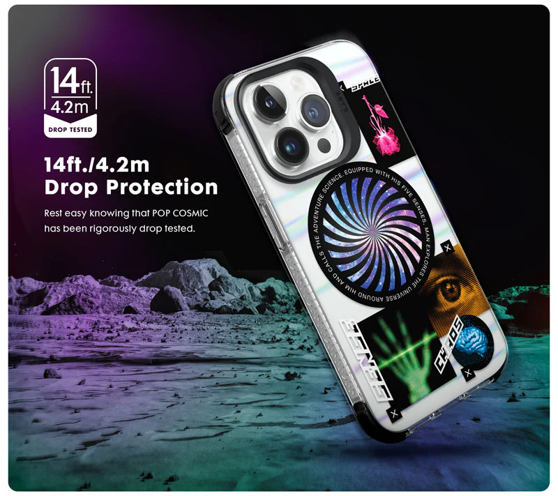 SiéNTENTENTE tranquilo sabiendo que POP COSMIC ha sido rigurosamente probado por caídas y proporciona una protección fiable contra caídas de 14 pies (4,2 m) para su iPhone 15.